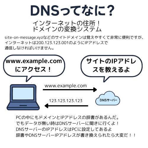 DNS(ドメインネームシステム)は、Webサイトの「名前(例:www.example.com)」を、実際のインターネット上の「IPアドレス(例:192.0.2.1)」に変換するしくみです。 これは「インターネットの電話帳」ともいえる存在で、DNSがあるからこそ、私たちは数字の羅列を覚えずにWebサイトへアクセスできます。